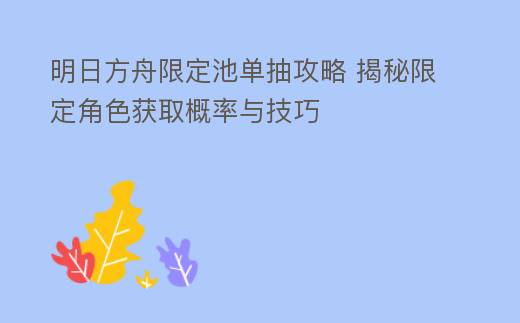 在《明日方舟》这款策略塔防游戏中,限定池单抽是许多玩家追求稀有干员的重要途径。限定池中的干员往往具有特殊的技能和属性,能够为玩家带来意想不到的战术优势。该该怎么办办以最经济的成本解锁心仪的干员,成为了许多玩家关注的焦点。本文将为您详细解析明日方舟限定池单抽的玩法、策略以及解决办法,助您轻松解锁心仪的稀有干员。